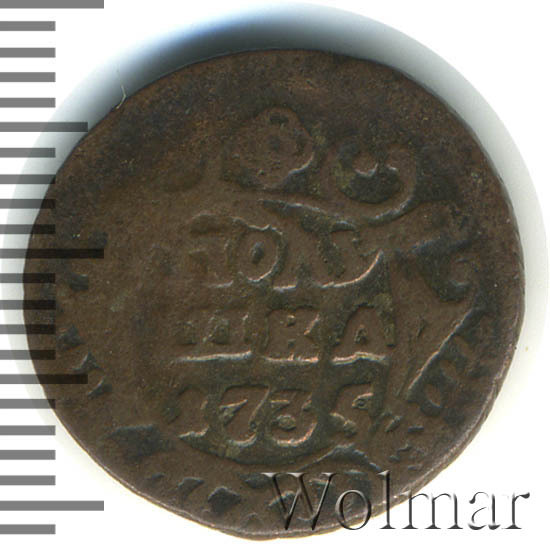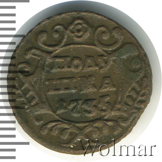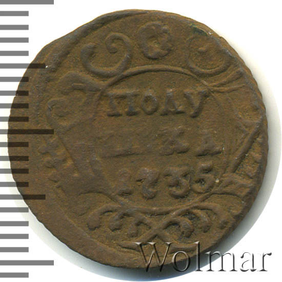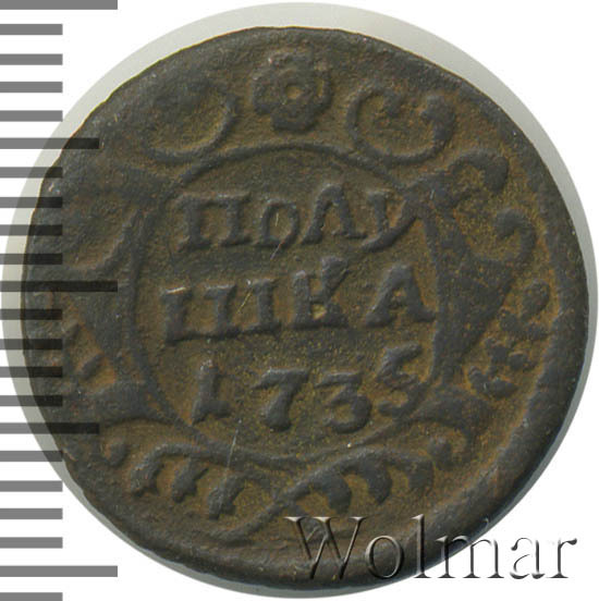 Полушка 1735 года чеканилась во времена правления императрицы Анны Иоанновны, племянницы Петра I. Вес медной монеты составлял 4,1 грамма, а гурт украшал шнуровой узор, защищавший монетный кружок от откусывания и обтачивания, цветного металла с краёв. Полушка по весу равнялась половине денги или четверти копейки, а её диаметр мог разниться на целых 2 мм из-за несовершенства технологии производства, чеканки не в монетном кольце. Стоимость полушки 1735 в "земляном сохране" не высока, ценятся монеты без следов коррозии и в хорошем коллекционном состоянии. Более подробно ознакомиться с ценой полушек 1735 года, Вы можете во вкладке "стоимость монет", так же Вы сможете принять участие в текущих нумизматических интернет - аукционах, во вкладке "активные лоты".
