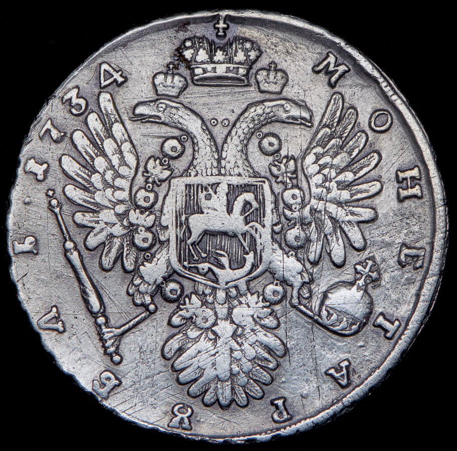 В центре изображен Государственный Герб Российской империи - двуглавый орёл с поднятыми вверх распущенными крыльями, головы которого увенчаны двумя коронами, третья, большая корона над ними. На груди орла расположен Московский герб - щит с изображением Георгия Победоносца, поражающего копьём дракона. Вокруг щита орденская цепь с орденом Св. апостола Андрея Первозванного. В правой лапе орла – скипетр, в левой – держава. Вокруг орла, обращённая внутрь, надпись: «МОНЕТА РУБЛЬ 1734».