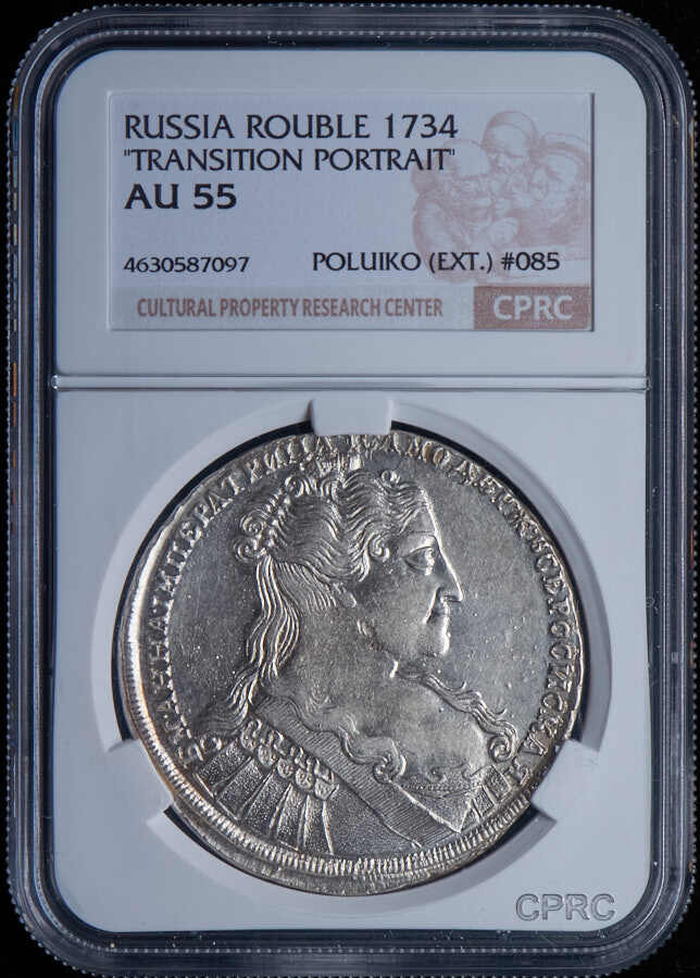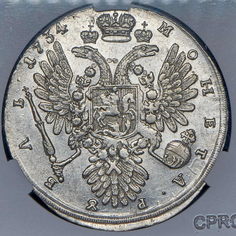 Рубль 1734 года. Переходный портрет. Биткин 89. R. В слабе NGC AU53. Серебро. Аукцион: RedSquareAuction Состояние: AU53 (AU) | 21.11.2021 |