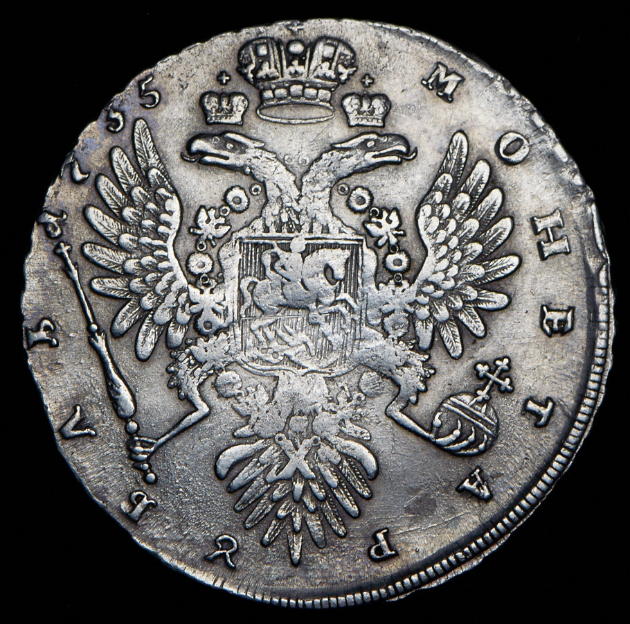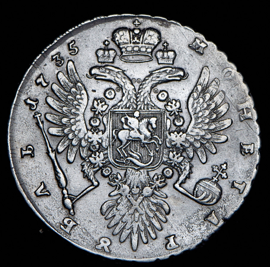 В центре изображен Государственный Герб Российской империи - двуглавый орёл с поднятыми вверх распущенными крыльями, головы которого увенчаны двумя коронами, третья, большая корона над ними. На груди орла расположен Московский герб - щит с изображением Георгия Победоносца, поражающего копьём дракона. Вокруг щита орденская цепь с орденом Св. апостола Андрея Первозванного. В правой лапе орла – скипетр, в левой – держава. Вокруг орла, обращённая внутрь, надпись: «МОНЕТА РУБЛЬ 1735».
