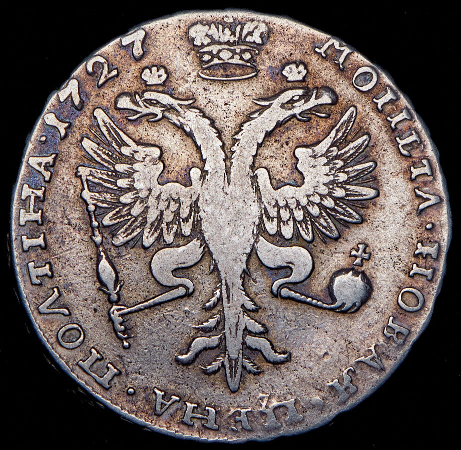 В центре изображен Государственный Герб Российской империи - двуглавый орёл с поднятыми вверх распущенными крыльями, головы которого увенчаны двумя коронами, третья, большая корона над ними. В правой лапе орла – скипетр, в левой – держава. Вокруг орла, обращённая внутрь, надпись: «МОНЕТА•НОВАЯ•ЦЕНА•ПОЛТIНА•1727».
