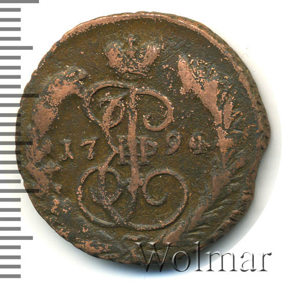 В центре изображён вензель Екатерины II. Над вензелем - императорская корона. По обеим сторонам от вензеля цифры даты выпуска монеты: слева «17», справа - «94» (1794 год). Вокруг центрального изображения, вдоль канта, изображён венок из лавровой и пальмовой ветвей, которые, в нижней части, перевязаны лентой на узел бантом.