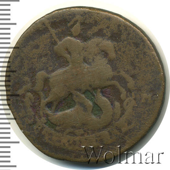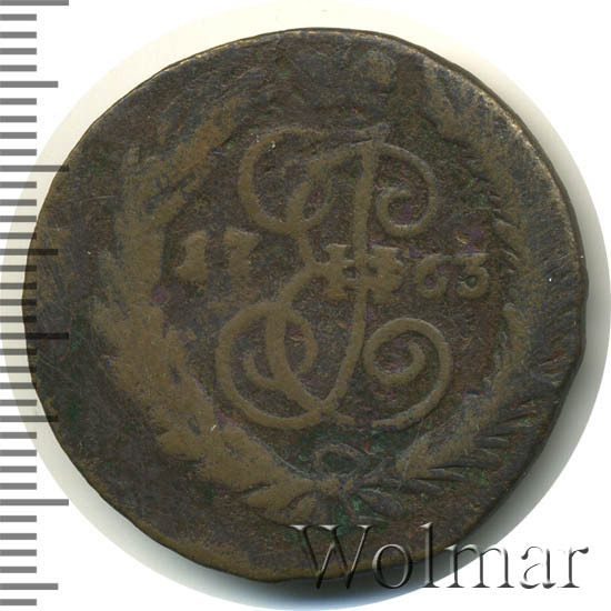 В центре изображён вензель Екатерины II. Над вензелем - императорская корона. По обеим сторонам от вензеля цифры даты выпуска монеты: слева - «17», справа - «63» (1763 год). Вокруг центрального изображения, вдоль канта, изображён венок из лавровой и пальмовой ветвей, которые, в нижней части, перевязаны лентой на узел бантом.