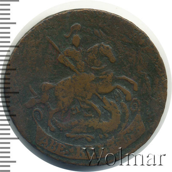 В центре изображён вензель Екатерины II. Над вензелем - императорская корона. По обеим сторонам от вензеля цифры даты выпуска монеты: слева - «17», справа - «66» (1766 год). Вокруг центрального изображения, вдоль канта, изображён венок из лавровой и пальмовой ветвей, которые, в нижней части, перевязаны лентой на узел бантом.