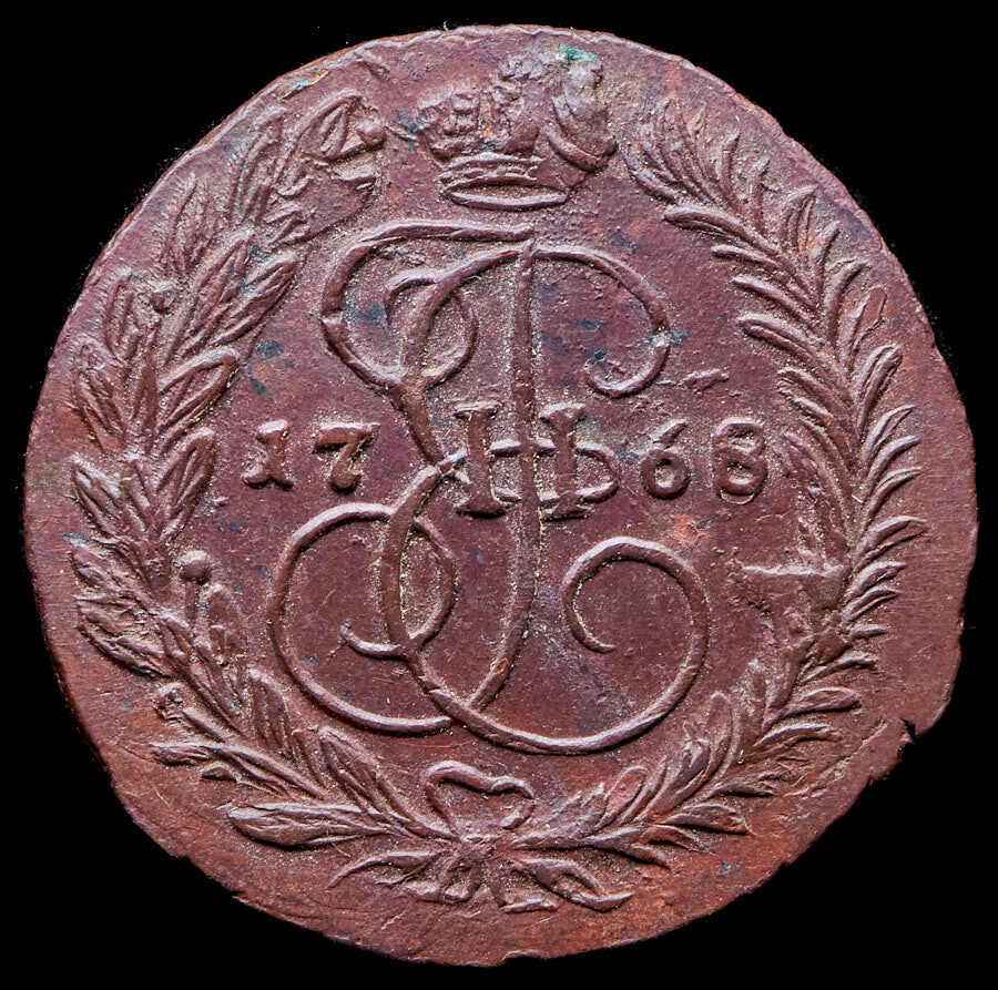 В центре изображён вензель Екатерины II. Над вензелем - императорская корона. По обеим сторонам от вензеля цифры даты выпуска монеты: слева - «17», справа - «68» (1768 год). Вокруг центрального изображения, вдоль канта, изображён венок из лавровой и пальмовой ветвей, которые, в нижней части, перевязаны лентой на узел бантом.