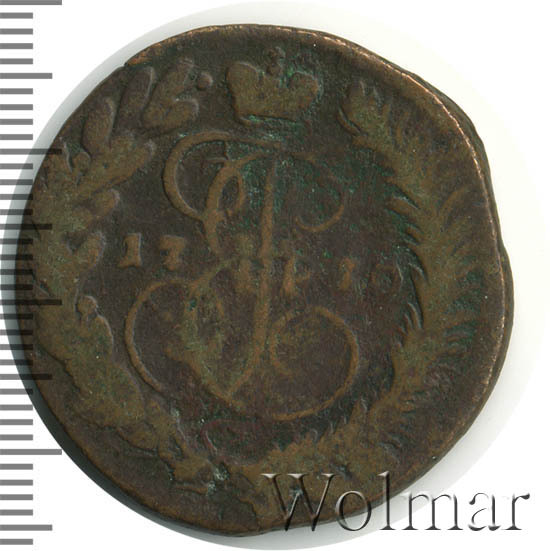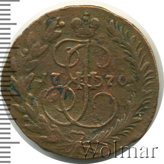 В центре изображён вензель Екатерины II. Над вензелем - императорская корона. По обеим сторонам от вензеля цифры даты выпуска монеты: слева - «17», справа - «70» (1770 год). Вокруг центрального изображения, вдоль канта, изображён венок из лавровой и пальмовой ветвей, которые, в нижней части, перевязаны лентой на узел бантом.