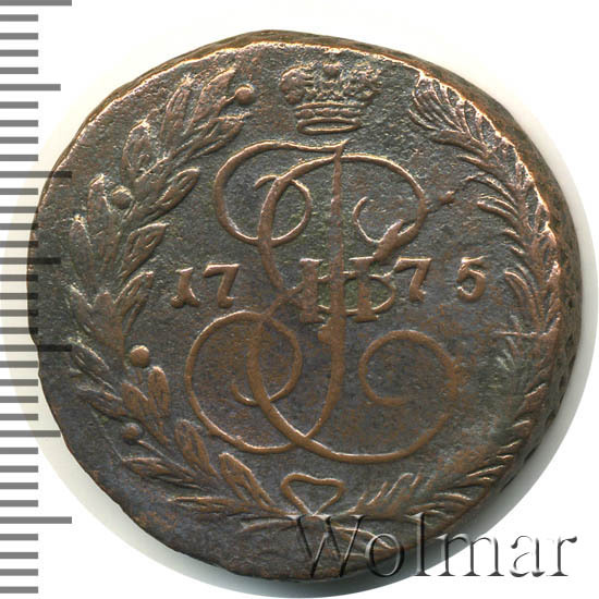 В центре изображён вензель Екатерины II. Над вензелем - императорская корона. По обеим сторонам от вензеля цифры даты выпуска монеты: слева - «17», справа - «75» (1775 год). Вокруг центрального изображения, вдоль канта, изображён венок из лавровой и пальмовой ветвей, которые, в нижней части, перевязаны лентой на узел бантом.