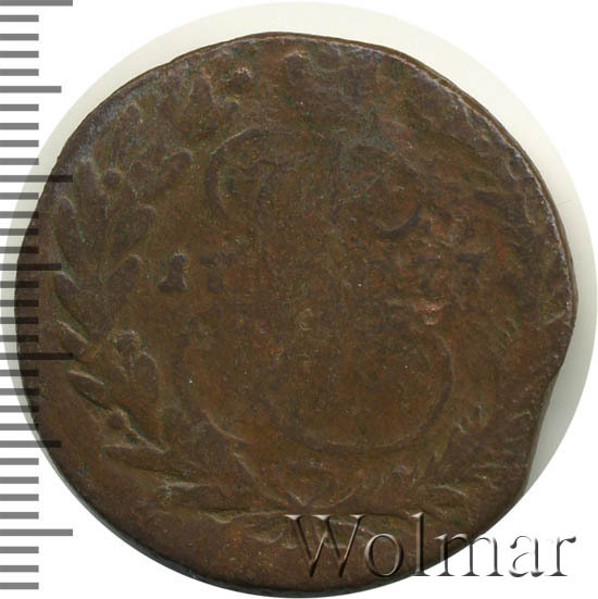 В центре изображён вензель Екатерины II. Над вензелем - императорская корона. По обеим сторонам от вензеля цифры даты выпуска монеты: слева - «17», справа - «77» (1777 год). Вокруг центрального изображения, вдоль канта, изображён венок из лавровой и пальмовой ветвей, которые, в нижней части, перевязаны лентой на узел бантом.