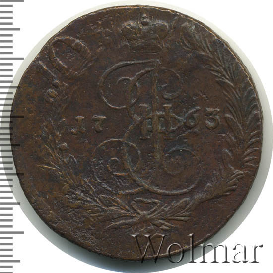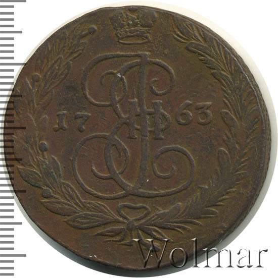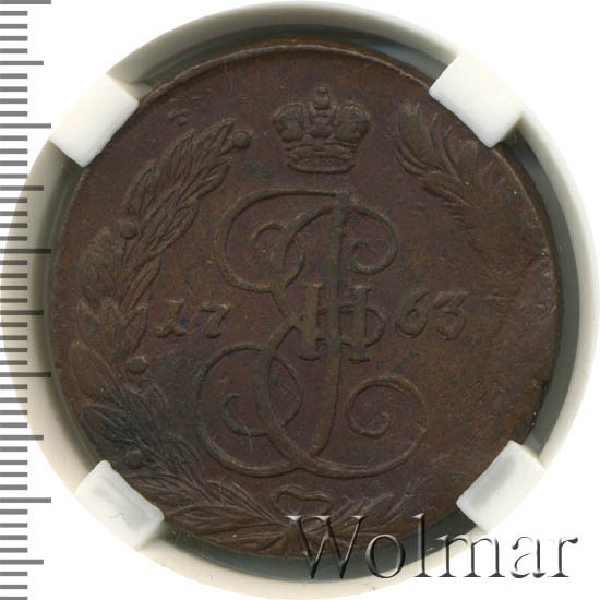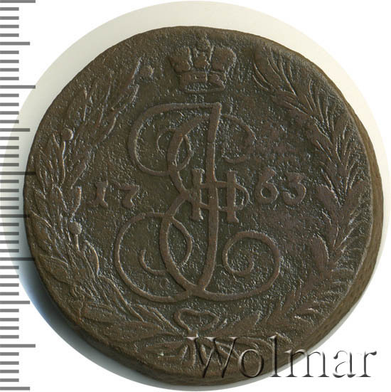 Пять копеек 1763 г., отчеканен на Екатеринбургском монетном дворе в период правления императрицы Екатерины Великой (1762 – 1796 гг.). С приходом к власти, Екатерина II изменила монетную стопу, действовавшую до неё. Теперь, медные номиналы, чеканили из расчета 16 рублей, а не как раньше 32 руб., из пуда меди. Все медные, «арматурные» деньги, выпущенные столь ненавистным ей мужем, подвергались изъятию из оборота и перечеканки в более полновесные монеты. Перечеканка велась и на Екатеринбургском монетном дворе. Из-за массового тиража и ограниченного срока на перечекан, попадаются экземпляры, 5 копеек 1763 ЕМ с остатками изображения от 10 копеек, образца 1762 г., которые массово перечеканивали в 5 копеек нового образца (см. фото).