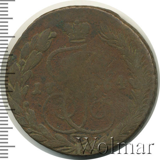 Большие медные пятаки весом более 50 грамм чеканились во времена Екатерины Великой 16-ти рублёвой монетной стопой, что означает что из пуда меди (16,38 кг) получалось разменной мелочи на 16 рублей. Выпуск был довольно объёмный и превышал 32 миллиона экземпляров. Гурт у пятаков сетчатый. Выше представлена монета Екатеринбургского монетного двора с буквенным обозначением ЕМ, ещё в этом году известны выпуски пятаков на Московском Красном монетном дворе (буквы ММ), Петербургском (СПМ) и Сестрорецком (СМ) монетных дворах. У Сестрорецких пяти копеек известны две разновидности с большими и малыми буквами, монеты с маленькими буквами считаются редкими. Очень редкими являются 5 копеек 1764 без буквенного обозначения двора.