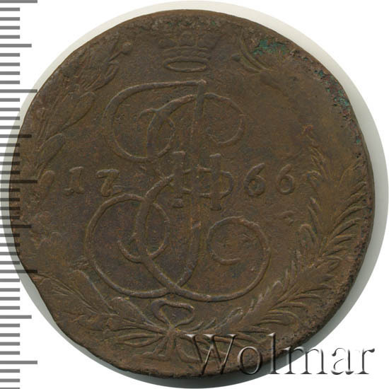 В центре изображён вензель Екатерины II. Над вензелем - императорская корона. По обеим сторонам от вензеля цифры даты выпуска монеты: слева - «17», справа - «66» (1766 год). Вокруг центрального изображения, вдоль канта, изображён венок из лавровой и пальмовой ветвей, которые, в нижней части, перевязаны лентой на узел бантом.