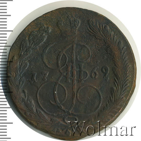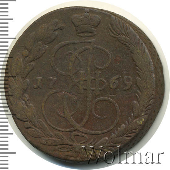 В центре изображён вензель Екатерины II. Над вензелем - императорская корона. По обеим сторонам от вензеля цифры даты выпуска монеты: слева - «17», справа - «69» (1769 год). Вокруг центрального изображения, вдоль канта, изображён венок из лавровой и пальмовой ветвей, которые, в нижней части, перевязаны лентой на узел бантом.