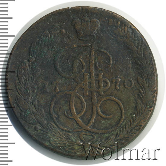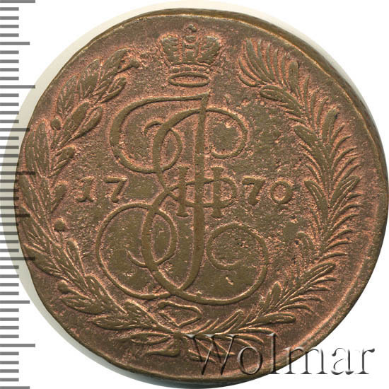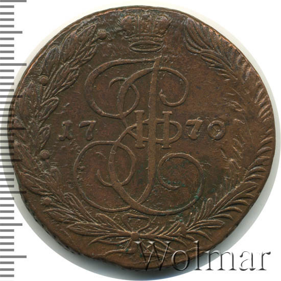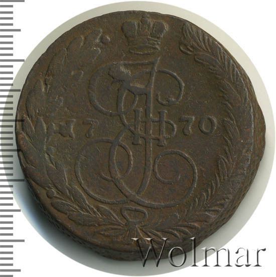 В центре изображён вензель Екатерины II. Над вензелем - императорская корона. По обеим сторонам от вензеля цифры даты выпуска монеты: слева - «17», справа - «70» (1770 год). Вокруг центрального изображения, вдоль канта, изображён венок из лавровой и пальмовой ветвей, которые, в нижней части, перевязаны лентой на узел бантом.