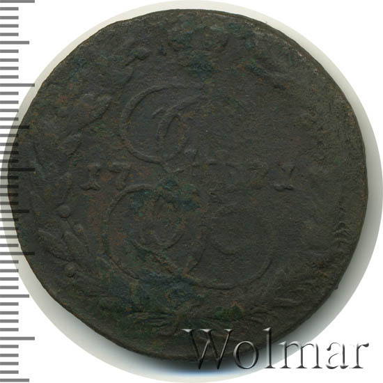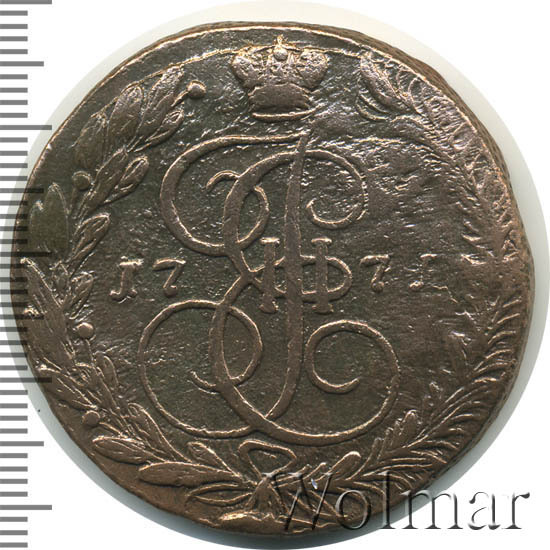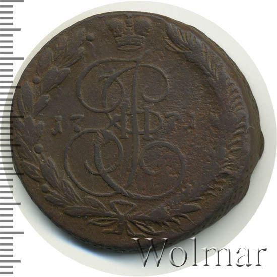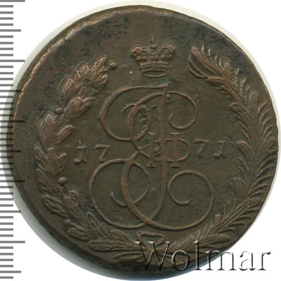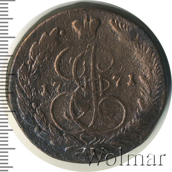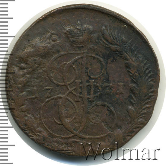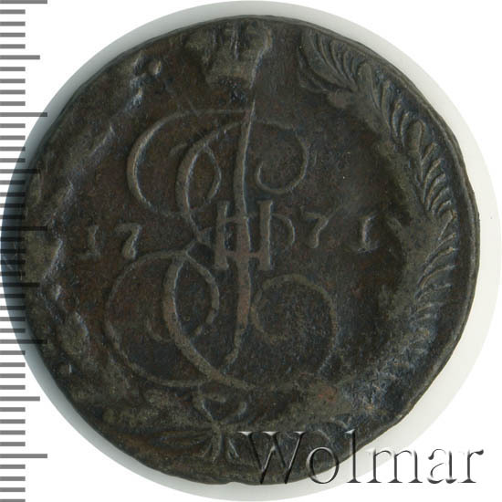 В центре изображён вензель Екатерины II. Над вензелем - императорская корона. По обеим сторонам от вензеля цифры даты выпуска монеты: слева - «17», справа - «71» (1771 год). Вокруг центрального изображения, вдоль канта, изображён венок из лавровой и пальмовой ветвей, которые, в нижней части, перевязаны лентой на узел бантом.