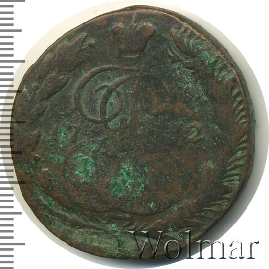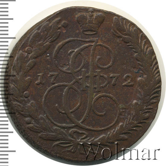 В центре изображён вензель Екатерины II. Над вензелем - императорская корона. По обеим сторонам от вензеля цифры даты выпуска монеты: слева - «17», справа - «72» (1772 год). Вокруг центрального изображения, вдоль канта, изображён венок из лавровой и пальмовой ветвей, которые, в нижней части, перевязаны лентой на узел бантом.