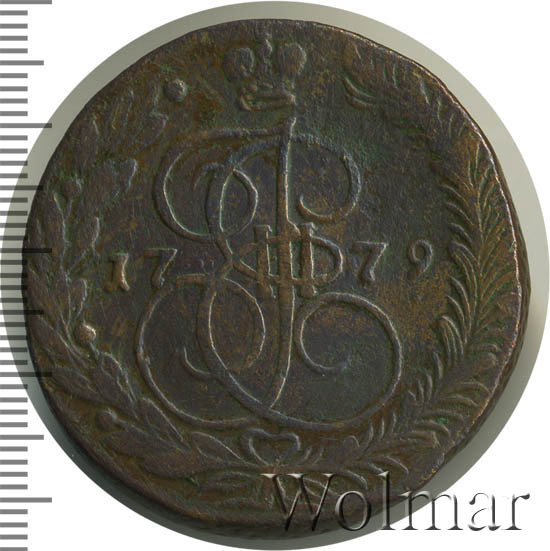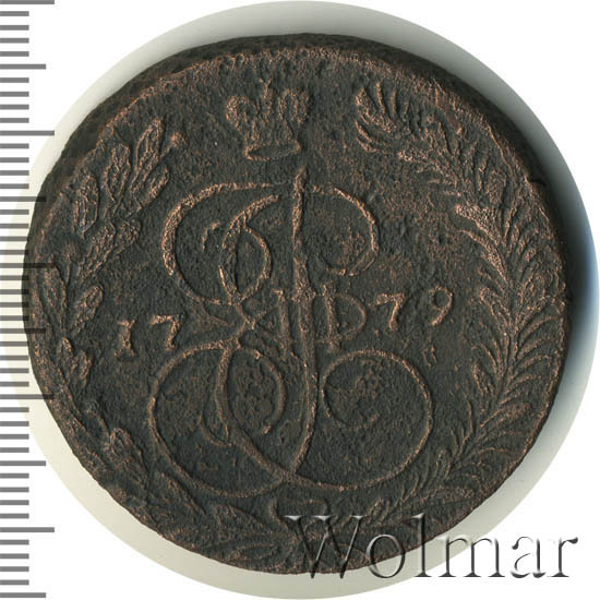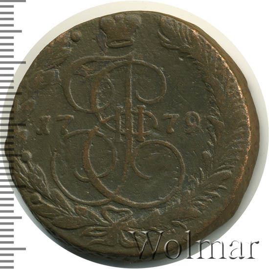 В центре изображён вензель Екатерины II. Над вензелем - императорская корона. По обеим сторонам от вензеля цифры даты выпуска монеты: слева - «17», справа - «79» (1779 год). Вокруг центрального изображения, вдоль канта, изображён венок из лавровой и пальмовой ветвей, которые, в нижней части, перевязаны лентой на узел бантом.