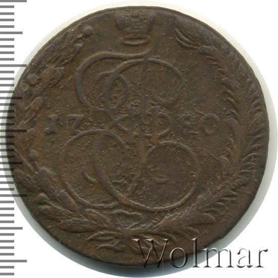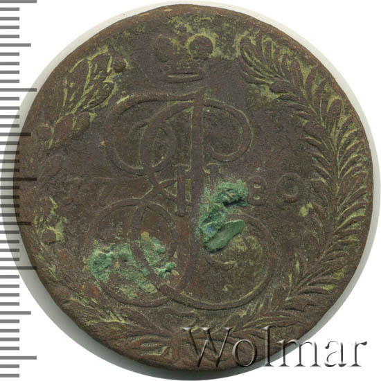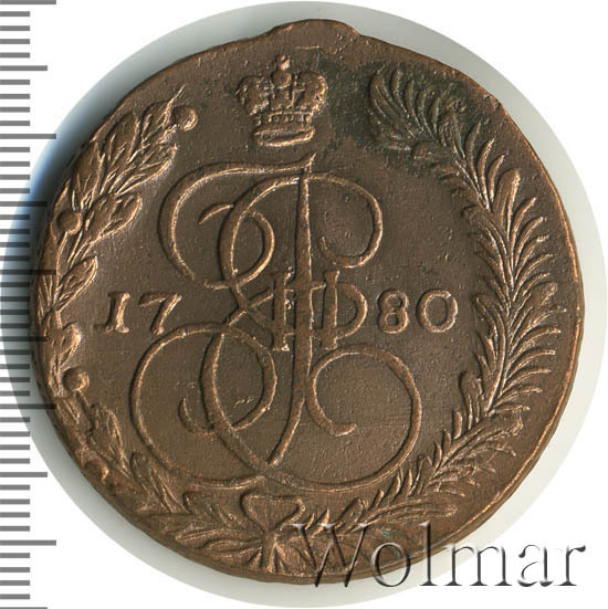 Крупная медная монета, врёмён правления императрицы Российской империи Екатерины II (Великой). Рядовой пятак, отчеканенный огромным, пятидесяти миллионным тиражом. Чеканка велась на Екатеринбургском монетном дворе, о чём свидетельствуют две буквы - ЕМ под лапами имперского орла, изображённого на аверсе 5 копеек 1780 г. В годы Екатерины Второй из пуда меди производилось 16 рублей разменных денег, так что пяти копеечная монета, весила чуть больше 51 грамма. Но, стоит отметить, этот вес не всегда выдерживался, разброс в ту или иную сторону, может составлять 20 и более %.
