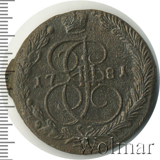В центре изображён вензель Екатерины II. Над вензелем - императорская корона. По обеим сторонам от вензеля цифры даты выпуска монеты: слева - «17», справа - «81» (1781 год). Вокруг центрального изображения, вдоль канта, изображён венок из лавровой и пальмовой ветвей, которые, в нижней части, перевязаны лентой на узел бантом.