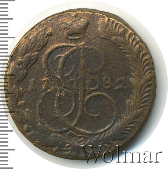 В центре изображён вензель Екатерины II. Над вензелем - императорская корона. По обеим сторонам от вензеля цифры даты выпуска монеты: слева - «17», справа - «82» (1782 год). Вокруг центрального изображения, вдоль канта, изображён венок из лавровой и пальмовой ветвей, которые, в нижней части, перевязаны лентой на узел бантом.