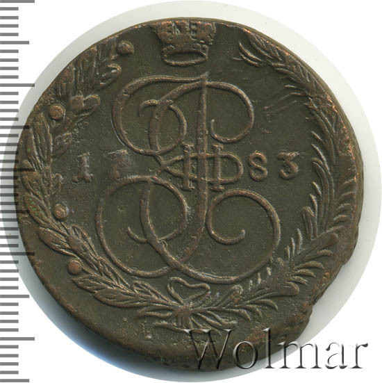 В центре изображён вензель Екатерины II. Над вензелем - императорская корона. По обеим сторонам от вензеля цифры даты выпуска монеты: слева - «17», справа - «83» (1783 год). Вокруг центрального изображения, вдоль канта, изображён венок из лавровой и пальмовой ветвей, которые, в нижней части, перевязаны лентой на узел бантом.