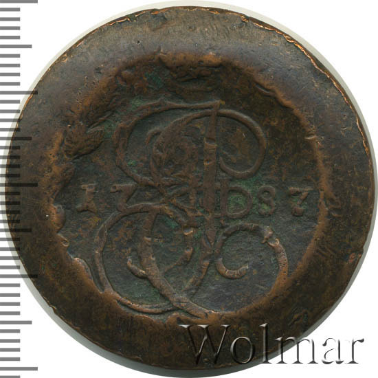 Екатерининские пятачки 1787 большие красивые медные монеты, чеканились на трёх монетных дворах по 16-ти рублёвой монетной стопе (16 рублей мелочью из пуда металла - 16,38 кг). Известно о выпуске в Екатеринбургском дворе (буквы ЕМ), Таврическом монетном дворе (буквы ТМ), расположенном в городе Феодосия на Крымском побережье и Сузунском монетном дворе (буквы КМ), ныне находящимся в Новосибирской области. У пятикопеечных монет известна масса разновидностей, разнящиеся шнуровым или сетчатым гуртом, размерами короны и вензеля императрицы или типом гербового орла.