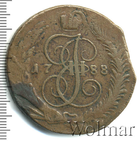 В центре изображён вензель Екатерины II. Над вензелем - императорская корона. По обеим сторонам от вензеля цифры даты выпуска монеты: слева - «17», справа - «88» (1788 год). Вокруг центрального изображения, вдоль канта, изображён венок из лавровой и пальмовой ветвей, которые, в нижней части, перевязаны лентой на узел бантом.