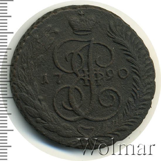 В центре изображён вензель Екатерины II. Над вензелем - императорская корона. По обеим сторонам от вензеля цифры даты выпуска монеты: слева - «17», справа - «90» (1790 год). Вокруг центрального изображения, вдоль канта, изображён венок из лавровой и пальмовой ветвей, которые, в нижней части, перевязаны лентой на узел бантом.