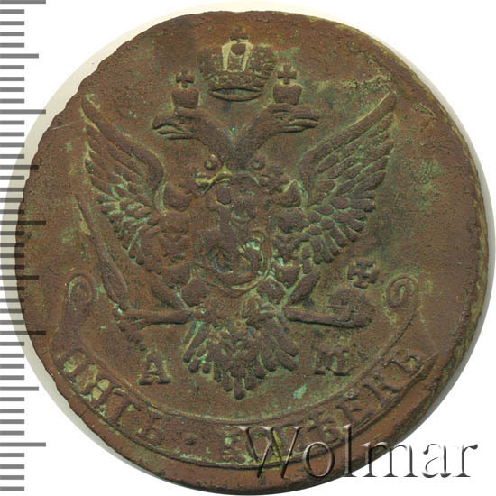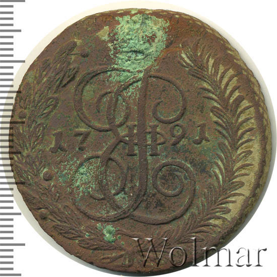 Аннинский монетный двор, на котором отчеканена эта вензельная монета, приступить к производству екатерининских пяти копеек, только в 1789 году. Про 5 копеек 1791 АМ, можно сказать, что она довольно нечастая. Стоимость этой монетки выше, чем у 5 копеек ЕМ, самой распространенной из этого года. Увеличение цены 5 коп. 1791 АМ зависит только от коллекционного состояния конкретного экземпляра.