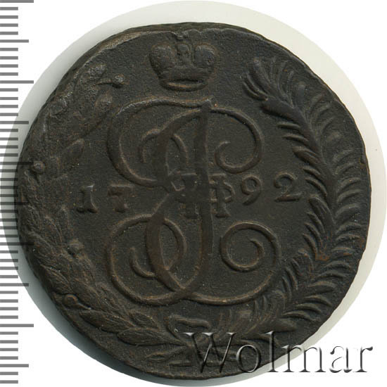 В центре изображён вензель Екатерины II. Над вензелем - императорская корона. По обеим сторонам от вензеля цифры даты выпуска монеты: слева - «17», справа - «92» (1792 год). Вокруг центрального изображения, вдоль канта, изображён венок из лавровой и пальмовой ветвей, которые, в нижней части, перевязаны лентой на узел бантом.