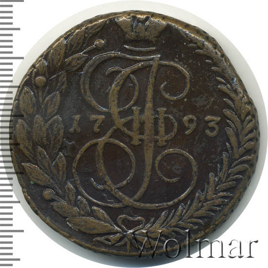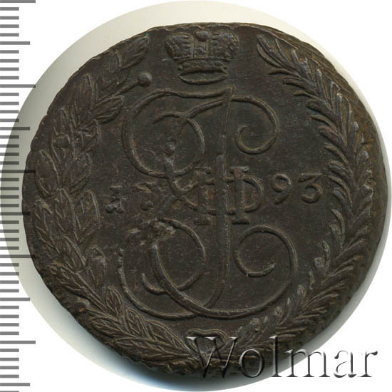 Все медные монеты, периода правления императрицы Екатерины II, которая по праву получила звучное имя в нашей истории – Великая, чеканились по 16-ти рублёвой стопе. Стоит отметить, что вес от номинального, может гулять, в обе стороны и довольно значительно. Производство пятаков 1793 ЕМ, велось на Екатеринбургском монетном дворе. Соостность сторон – 0 градусов (медальная). По весовым и геометрическим параметрам и дизайну, соответствует типу вензельных пятаков, образца 1763 – 1796 гг. Известны экземпляры этой монеты с передатировкой (1793/92).
