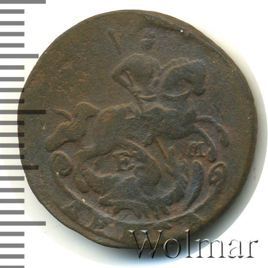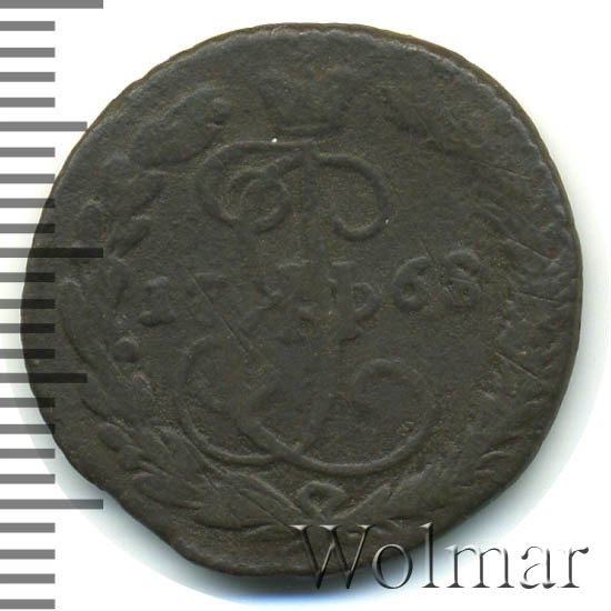 В центре изображён вензель Екатерины II. Над вензелем - императорская корона. По обеим сторонам от вензеля цифры даты выпуска монеты: слева «17», справа - «68» (1768 год). Вокруг центрального изображения, вдоль канта, изображён венок из лавровой и пальмовой ветвей, которые, в нижней части, перевязаны лентой на узел бантом.