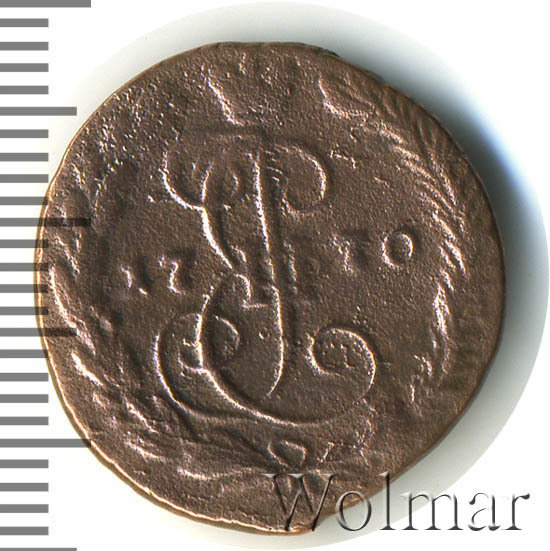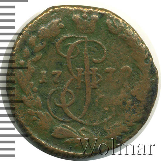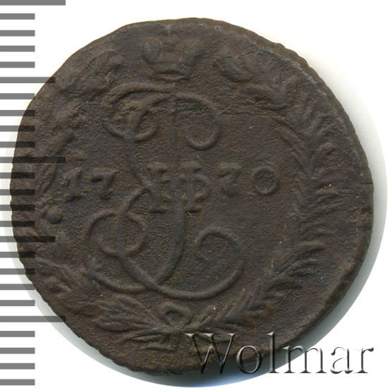 В центре изображён вензель Екатерины II. Над вензелем - императорская корона. По обеим сторонам от вензеля цифры даты выпуска монеты: слева «17», справа - «70» (1770 год). Вокруг центрального изображения, вдоль канта, изображён венок из лавровой и пальмовой ветвей, которые, в нижней части, перевязаны лентой на узел бантом.
