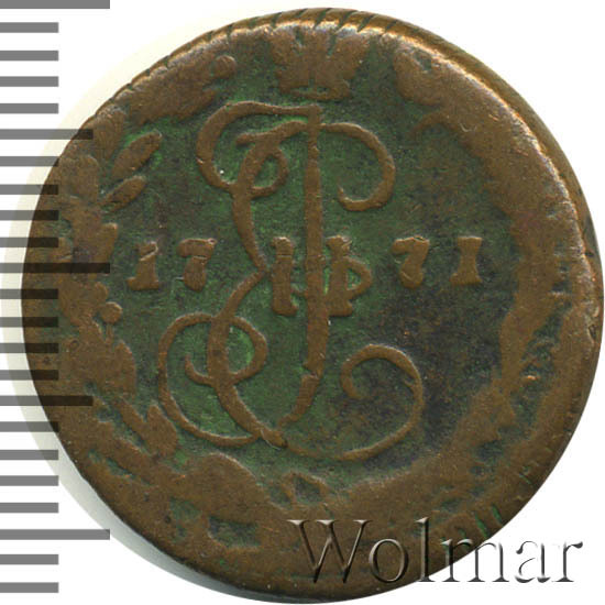 В центре изображён вензель Екатерины II. Над вензелем - императорская корона. По обеим сторонам от вензеля цифры даты выпуска монеты: слева «17», справа - «71» (1771 год). Вокруг центрального изображения, вдоль канта, изображён венок из лавровой и пальмовой ветвей, которые, в нижней части, перевязаны лентой на узел бантом.