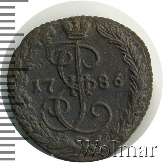 В центре изображён вензель Екатерины II. Над вензелем - императорская корона. По обеим сторонам от вензеля цифры даты выпуска монеты: слева «17», справа - «86» (1786 год). Вокруг центрального изображения, вдоль канта, изображён венок из лавровой и пальмовой ветвей, которые, в нижней части, перевязаны лентой на узел бантом.