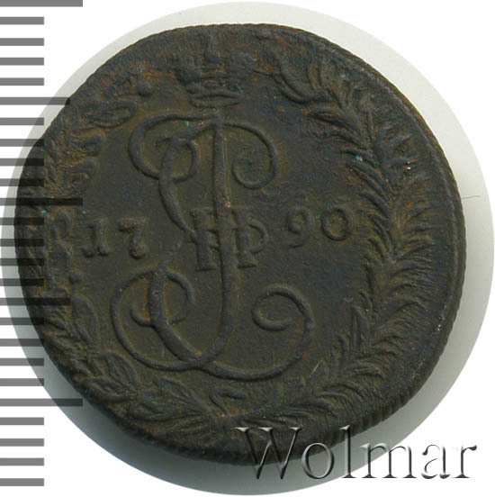 В центре изображён вензель Екатерины II. Над вензелем - императорская корона. По обеим сторонам от вензеля цифры даты выпуска монеты: слева «17», справа - «90» (1790 год). Вокруг центрального изображения, вдоль канта, изображён венок из лавровой и пальмовой ветвей, которые, в нижней части, перевязаны лентой на узел бантом.