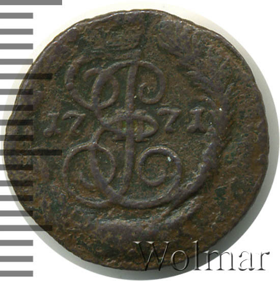 В центре изображён вензель Екатерины II. Над вензелем - императорская корона. По обеим сторонам от вензеля цифры даты выпуска монеты: слева «17», справа - «71» (1771 год). Вокруг центрального изображения, вдоль канта, изображён венок из лавровой и пальмовой ветвей, которые, в нижней части, перевязаны лентой на узел бантом.