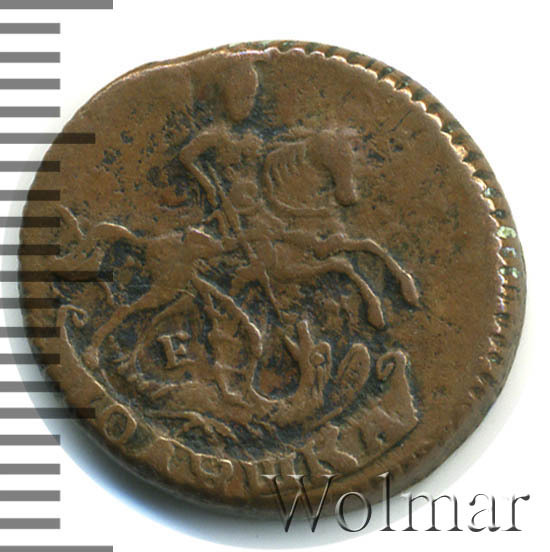 В центре — рельефное изображение Георгия Победоносца верхом на коне, поражающего копьём дракона. Под конём - буквы «Е» и «М». Внизу, под центральным изображением, полукругом располагается бандероль с обозначением номинала - «ПОЛУШКА».