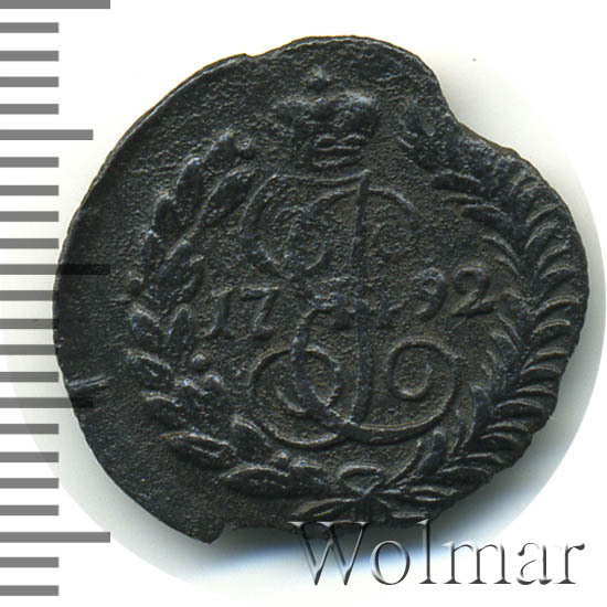 В центре изображён вензель Екатерины II. Над вензелем - императорская корона. По обеим сторонам от вензеля цифры даты выпуска монеты: слева «17», справа - «92» (1792 год). Вокруг центрального изображения, вдоль канта, изображён венок из лавровой и пальмовой ветвей, которые, в нижней части, перевязаны лентой на узел бантом.