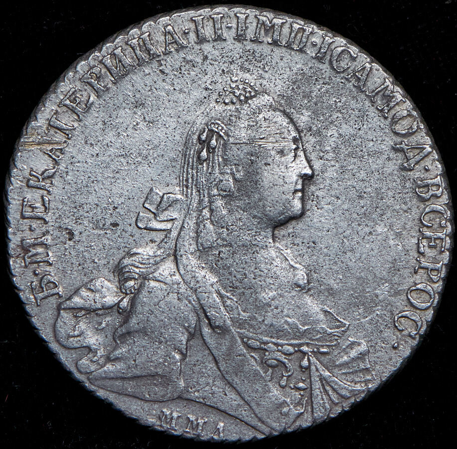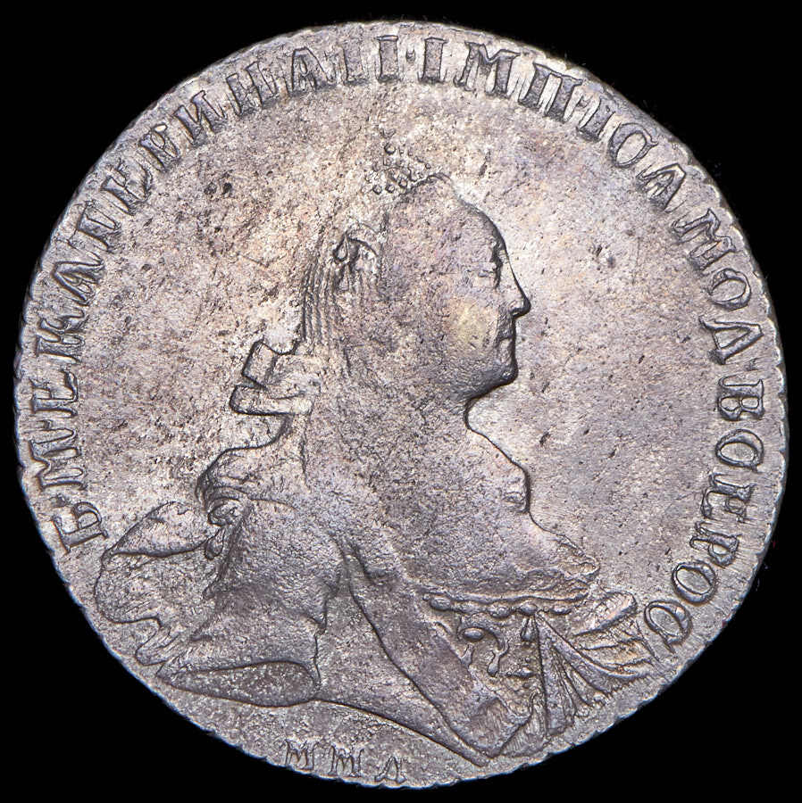 В центре профильный портрет вправо императрицы Екатерины II. Вокруг портрета круговая надпись: «Б•М•ЕКАТЕРИНА•II•IМП•IСАМОД•ВСЕРОС». Под портретом буквы «М М Д», обозначение Московского монетного двора.