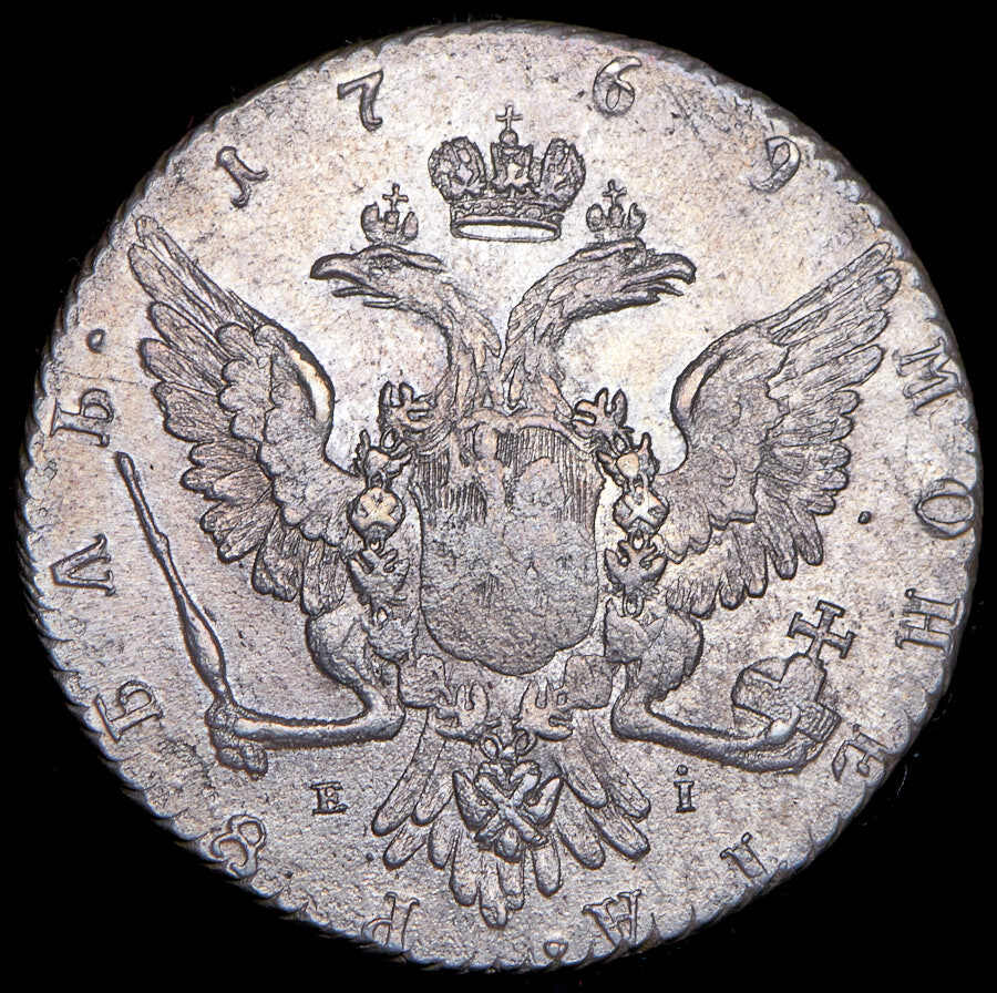 В центре изображен Государственный Герб Российской империи - двуглавый орёл, головы которого увенчаны двумя коронами, третья, большая корона над ними. На груди орла расположен Московский герб - щит с изображением Георгия Победоносца, поражающего копьем дракона. Вокруг щита орденская цепь с орденом Св. Апостола Андрея Первозванного. В правой лапе орла – скипетр, в левой – держава. Под правой лапой – буква «Е», под левой – буква «I». Инициалы минцмейстера Егора Иванова. Над орлом дата выпуска монеты – «1769». Вокруг орла, обращенная внутрь, надпись: «МОНЕТА•РУБЛЬ•».