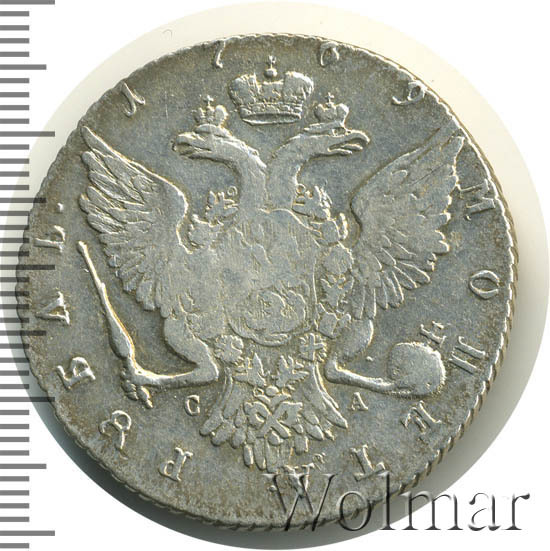 Серебряная монета достоинством 1 рубль, датированная 1769 годом, отчеканена на монетном дворе г. Санкт-Петербург, о чем свидетельствуют буквы "СПБ" под портретом Императрицы Екатерины II. Буквы TI в рукаве Императрицы - инициалы медальера Тимофея Иванова, который изобразил портрет Екатерины II. Буквы СА под орлом на реверсе - инициалы минцмейстера Петербургского монетного двора Степана Афанасьева, который занимал эту должность с 1764 по 1770год. Наибольшую ценность представляют экземпляры в сохранности UNC. Существует еще 1 монета того же года и номинала, но с отличными буквами 1 рубль 1769 года ММД ДМ. Это второй тип портрета на рублях Екатерины Второй.Данный тип монет чеканился в неизменном виде с1766 по 1776гг.