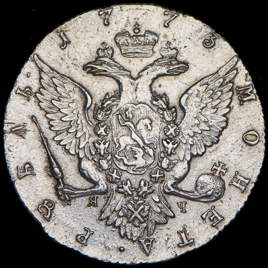 Серебряная монета достоинством 1 рубль, датированная 1773 годом, отчеканена на монетном дворе г. Санкт-Петербург, о чем свидетельствуют буквы "СПБ" под портретом Императрицы Екатерины II. Буквы TИв рукаве Императрицы - инициалы медальера Тимофея Иванова, который изобразил портрет Екатерины II. Буквы ЯЧ под орлом на реверсе - инициалы минцмейстера Петербургского монетного двора Яков Чернышев, который занимал эту должность с 1770 по 1776г.год. Наибольшую ценность представляют экземпляры в сохранности UNC. Существует еще 2 монеты того же года и номинала, но с отличными буквами:1 рубль 1773 СПБ ФЛ и редкий"особый портрет"1 рубль 1773 года СПБ (ТI ЯЧ). Данный тип монет чеканился в неизменном виде с1766 по 1776гг.