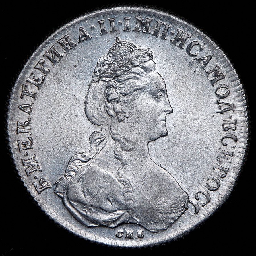 В центре профильный портрет вправо императрицы Екатерины II. Вокруг портрета круговая надпись: «Б•М•ЕКАТЕРИНА•II•IМП•ИСАМОД•ВСЕРОСС•». Под портретом буквы «С П Б», обозначение Санкт-Петербургского монетного двора. По окружности канта имеются рельефные элементы, выполненные в виде зубцов.