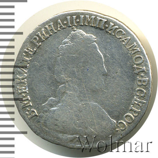 В центре профильный портрет вправо императрицы Екатерины II. Вокруг портрета круговая надпись: «Б•М•ЕКАТЕРИНА•II•IМП•ИСАМОД•ВСЕРОС•». Под портретом буквы «С П Б», обозначение Санкт-Петербургского монетного двора.