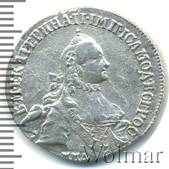 В центре профильный портрет вправо императрицы Екатерины II. Вокруг портрета круговая надпись: «Б•М•ЕКАТЕРИНА•II•IМП•IСАМОД•ВСЕРОС». Под портретом буквы «М М Д», обозначение Московского монетного двора.