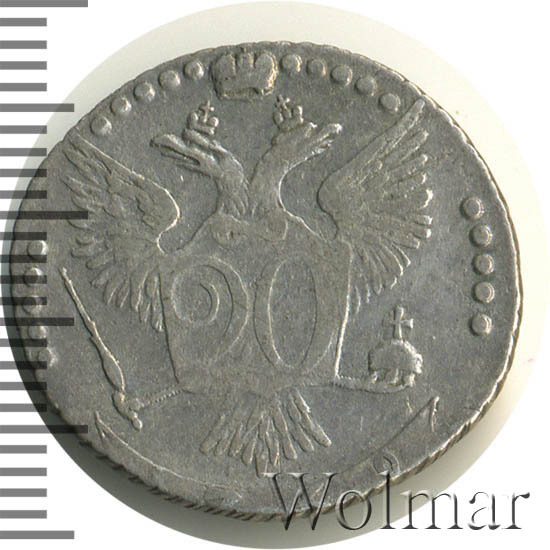В центре изображен Государственный Герб Российской империи - двуглавый орёл, головы которого увенчаны двумя коронами, третья, большая корона над ними. В правой лапе орла – скипетр, в левой – держава. На груди орла щит с обозначением номинала - цифрой «20». Вокруг орла, вдоль канта, 20 счётных точек, разделённые на 4 группы по пять точек. Также обозначающие номинал монеты. Ниже орла, на стилизованной ленте, дата выпуска - «1769».