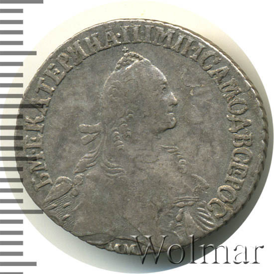 В центре профильный портрет вправо императрицы Екатерины II. Вокруг портрета круговая надпись: «Б•М•ЕКАТЕРИНА•II•IМП•IСАМОД•ВСЕРОС». Под портретом буквы «М М Д», обозначение Московского монетного двора.