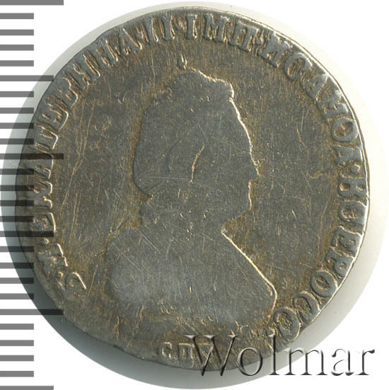 В центре профильный портрет вправо императрицы Екатерины II. Вокруг портрета круговая надпись: «Б•М•ЕКАТЕРИНА•II•IМП•ИСАМОД•ВСЕРОСС•». Под портретом буквы «С П Б», обозначение Санкт-Петербургского монетного двора.