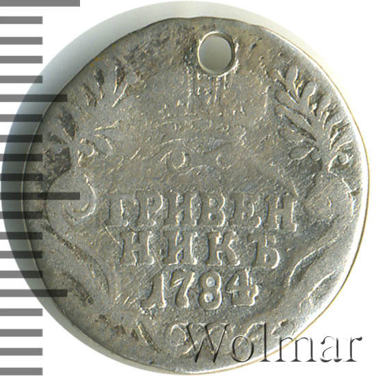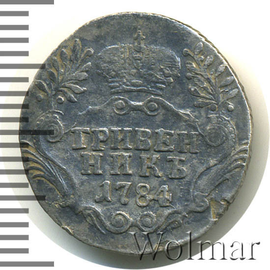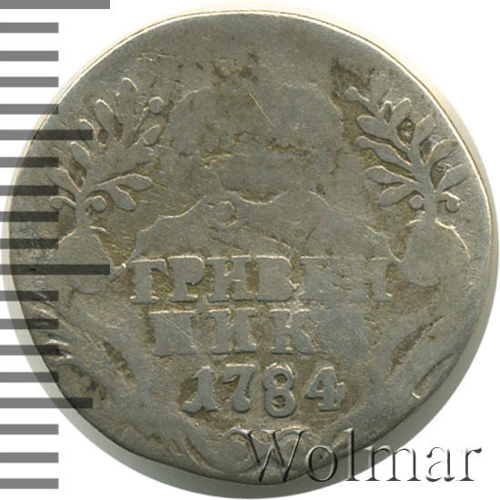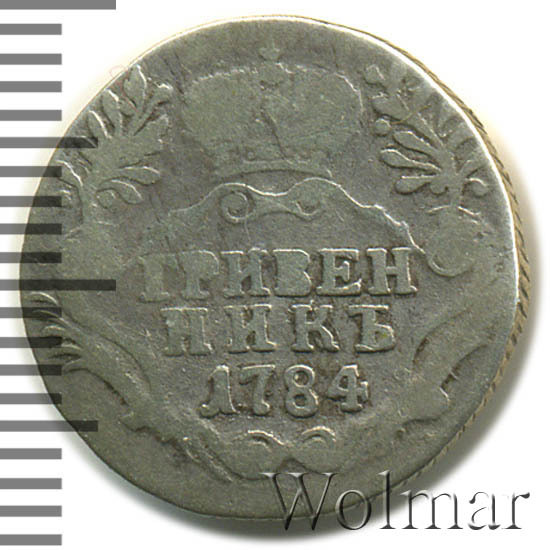 В центре изображен картуш с надписью в две строки: «ГРИВЕН»│«НИКЪ». Под надписью дата выпуска - «1784». Картуш венчает императорская корона. Слева и справа, из боковых виньеток картуша, по направлению к короне, выходят две стилизованные лавровые ветви.