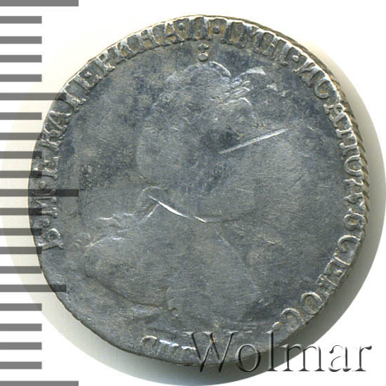 В центре профильный портрет вправо императрицы Екатерины II. Вокруг портрета круговая надпись: «Б•М•ЕКАТЕРИНА•II•IМП•ИСАМОД•ВСЕРОС•». Под портретом буквы «С П Б», обозначение Санкт-Петербургского монетного двора.